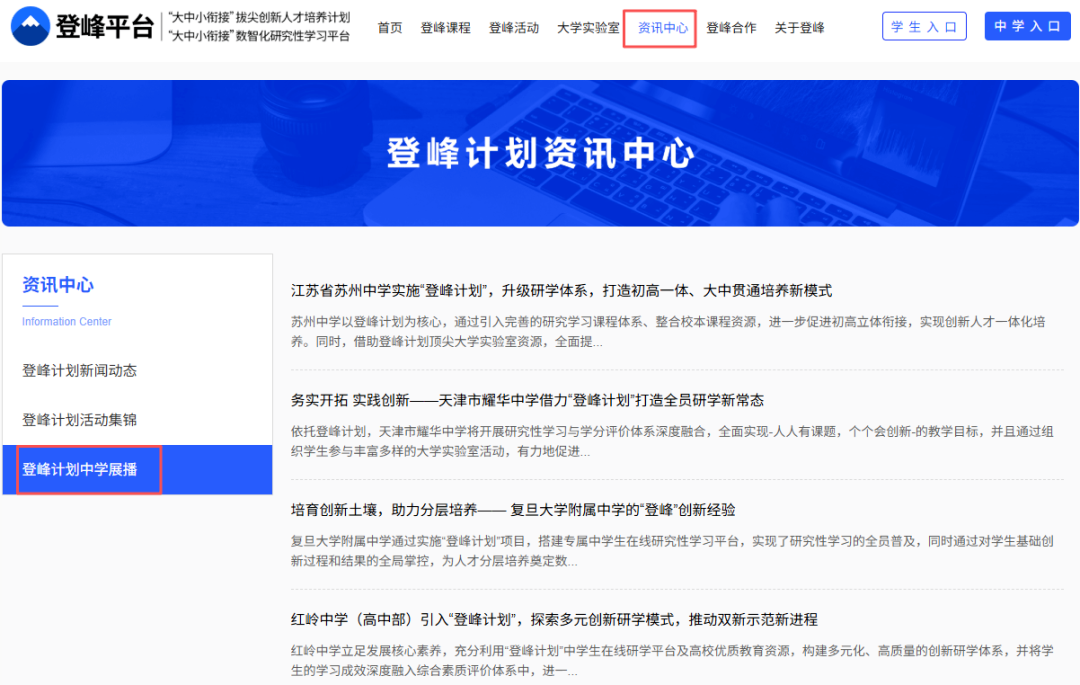 1. 登峰平台官网(资讯中心-中学展播)