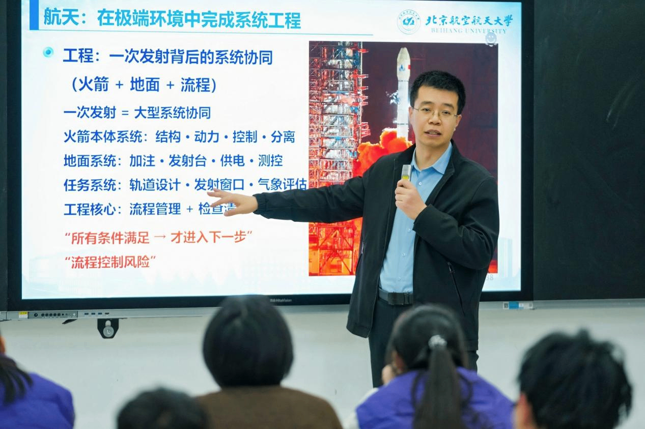 齐海涛教授在《科学、技术与工程的关系——从原理到天空的翅膀》讲座中,以航空航天领域为例,阐释了三者的核心定位与区别,引导同学们理解工程是“在约束条件下整合技术、实现可靠系统”的创造性过程。